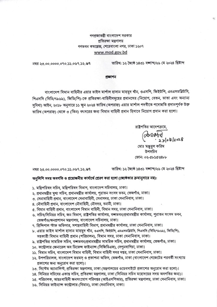 উপসচিব মো. মুঞ্জুরুল করিম স্বাক্ষরিত ওই প্রজ্ঞাপনে বলা হয়, হাসান মাহমুদ খাঁনকে এয়ার ভাইস মার্শাল পদবীতে পদোন্নতি প্রদানপূর্বক ১১ জুন থেকে তিন বছরের জন্য বিমানবাহিনী প্রধান হিসেবে নিয়োগ দেয়া হয়েছে।