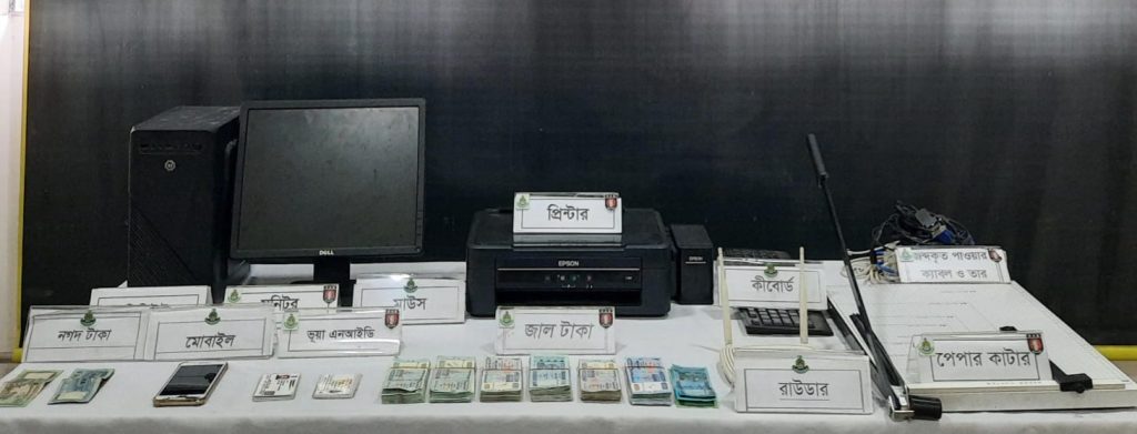 তিনি জানান, গ্রেফতারকৃত আসামির হেফাজত থেকে জালনোট তৈরীতে ব্যবহৃত ১ টি সিপিইউ, ১ টি মনিটর, ১ টি প্রিন্টার, ১ টি কী-বোর্ড, ১ টি মাউস, ১ টি রাউটার, ২ টি মাল্টিপ্লাগ, ১ টি পেপার কাটার, ৯ টি ভুয়া এনআইডি কার্ড, ৩ টি ভুয়া ভারতীয় এনআইডি কার্ডের ফটোকপি এবং ৬০,৭০০/- টাকা মূল্যমানের জালটাকা (৬০২ টি ১০০ টাকার নোট এবং ০১ টি ৫০০ টাকার নোট) উদ্ধার করা হয়।