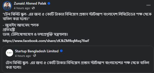 তিনি লিখেছেন, ‘টেন মিনিট স্কুল- এর জন্য ৫ কোটি টাকার বিনিয়োগ প্রস্তাব স্টার্টআপ বাংলাদেশের পক্ষ থেকে বাতিল করা হলো।’