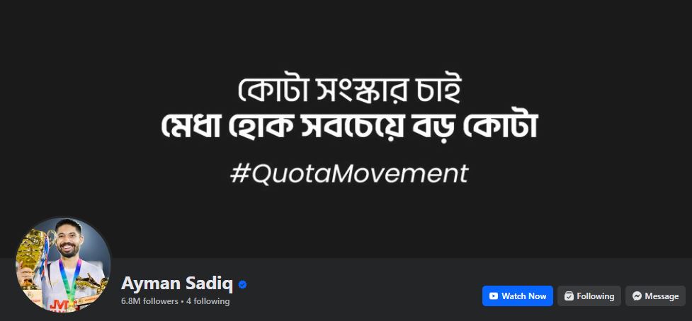 এমনকি তার নিজের ফেসবুক পেজের কভার ফটোতেও লেখা রয়েছে ‘কোটা সংস্কার চাই, মেধা হোক সবচেয়ে বড় কোটা’।