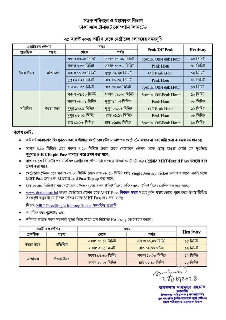 অবশেষে,আজ রোববার (২৫ আগস্ট) সকাল হতে ঢাকার উত্তরা থেকে মতিঝিল পথে মেট্রোরেল চলাচল শুরু হলো। তবে ‘মিরপুর-১০’ ও ‘কাজীপাড়া স্টেশন’এ আপাতত মেট্রোরেল থামবে না এবং যাত্রীসেবা কার্যক্রম বন্ধ থাকবে।