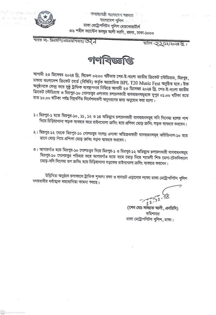 বিজ্ঞপ্তিতে আরও বলা হয়,অনুষ্ঠান চলাকালে ট্রাফিক শৃঙ্খলা রক্ষা ও যানজট এড়ানোর লক্ষ্যে ঢাকা মহানগর পুলিশ নগরবাসীর সর্বাত্মক সহযোগিতা কামনা করেছে।